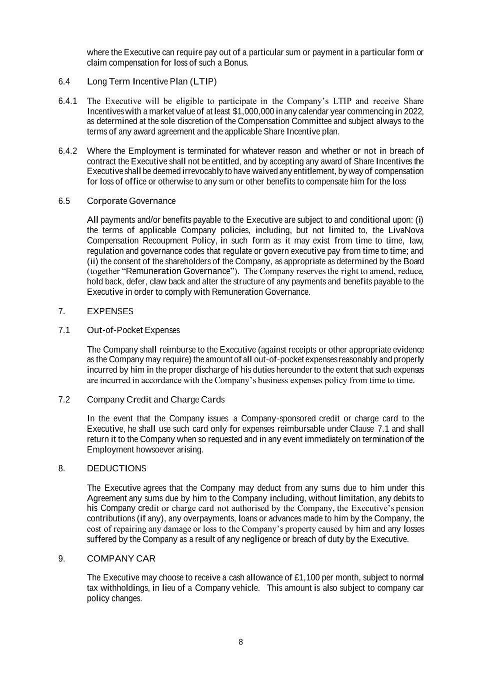 On July 28, 2021, the Compensation Committee of the LivaNova Board of Directors approved a contract with Mr. Shvartsburg with respect to his employment as CFO. The contract provides for: (a) an annual base salary of not less than £330,000; (b) a 2021 short term incentive target bonus equal to 65% of the aforementioned salary; (c) eligibility to participate in the Company’s long term incentive plan and receive share incentives with a market value of at least $1,000,000 in any calendar year commenting in 2022, as determined at the sole discretion of the Compensation Committee; (d) annual pension allowance in an amount equal to 15% base + bonus; (e) a car allowance at £1,100 per month; and (f) a notice of termination of employment period of twelve months.
